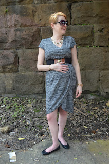 dress-French Connection via Le Tote(more dresses here), belt-Gap(more belts here), necklace-Banana Republic(similarish here), flats-J.Crew Factory, bracelet-Jewel Mint, watch-Nixon via Urban Outfitters