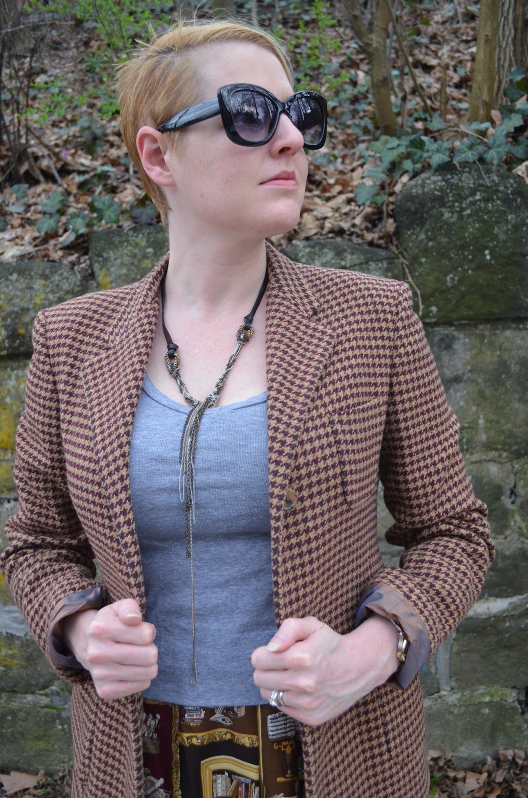 This skirt, is WAY old, bought back in '07/'08, like here and here this is a piece that was too big pre-baby, but is finding it's way into my wardrobe as my body continues to be in transition. Not wanting to be too preppy I went with a plain old grey tee, but kept the scholarly theme of the skirt going in this blazer. And speaking of transitions, these boots are a great way to leave off the tights of winter, but not blind passersby with my glaringly pale legs. Spring is here, but that doesn't mean my gams are warm-weather ready just yet.