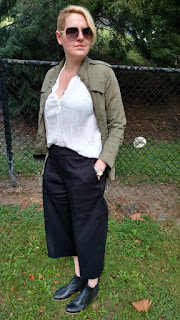 This outfit is the epitome of "alternative" business casual. The pieces when taken on their own are perfectly acceptable for the workplace, but when paired up this beachy-esque blouse, oversized culottes, chelsea boots, and military jacket create office wear with an edge! And long-time readers know that I love me some edge. As we're now into September, but still experiencing August weather it can be difficult to outfit. I'm just dying to bust out some of my recent fall purchases (seen here), but I'm not quite ready for them with daily highs still in the 70s and 80s. So, instead I'm doing some transitional/hybrid outfitting with easy tops and bottoms, "shaped" by a blazer or jacket.