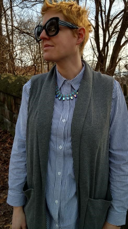 I've always had a soft spot for "fancy pants" as seen here, here, and here. This brocade pair is the latest addition to my collection. I was going for a long n' lean silhouette with the button-down tunic and oversize sweater vest, which are semi-casual and offered a nice contrast to the fancy bottoms. Wearing the vibrant necklace OVER the shirt works as a fem take on a bow tie, don't you agree? Again, it's about striking a balance between formal/casual, cropped/long, comfortable/fitted, and feminine/androgynous.