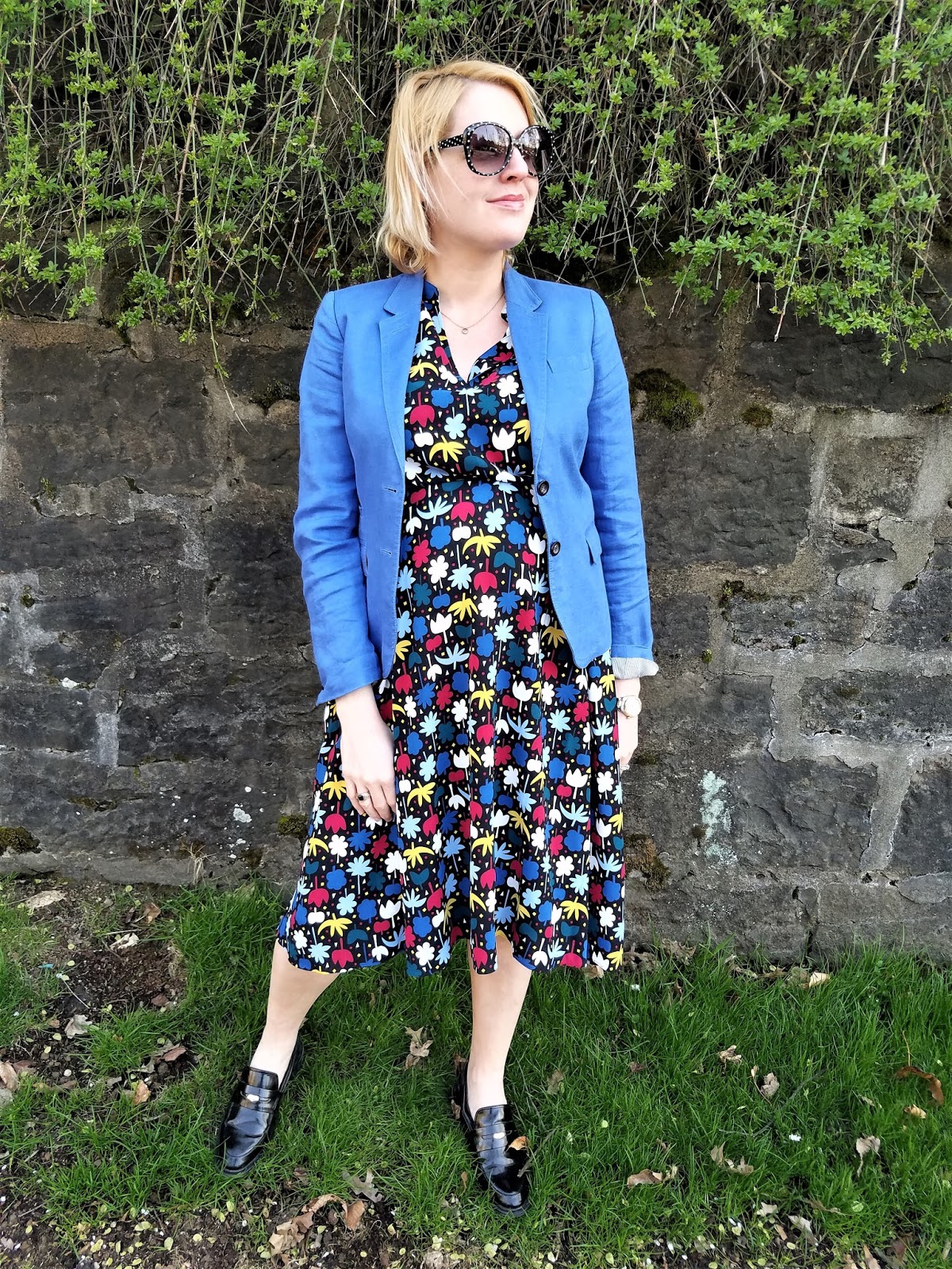 Last month I styled this midi-drawstring dress with a striped wrap and flats here. For this OOTD I was all about business in a bright blazer and menswear-esque loafers. Overall, this dress has been serving me beyond awesomely (is awesomely a word? It is NOW!). The print is fun and graphic, the silhouette with its adjustable drawstring is super-flattering, and of course the pockets. Plus, I receive a ton of compliments when wearing it. Not compliments on the dress itself, but compliments about how great I look, and how well I'm "wearing" my pregnancy. I think that's the sign of a good garment, when it works so well people notice how great you look, not necessarily a particular piece.