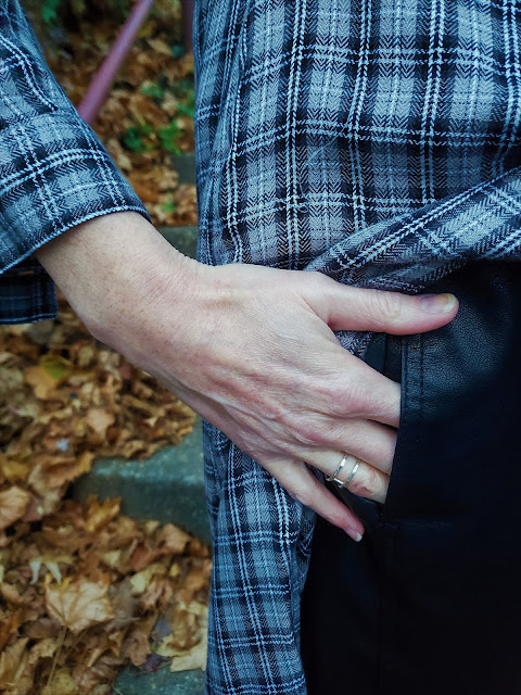 I last featured this flannel midi in this post and I'm struck by how different the styling is between these two outfits. In the earlier look I leaned into the casual modern grunge vibe of this flannel. Here I went with an edgy layered take that is still casual, but feels more polished. One of the challenges with this dress is the length and side-slits. You can't really wear it solo, like a dress, nor can you tuck it in like a shirt. I've done some fancy half-tug here and added this cropped wrap top to create a more fitted silhouette. Proportion can be tricky with oversized pieces and it definitely takes a bit of experimentation to find a balance. Speaking of balance, I wanted to point out the contrast in jewelry for this OOTD. This novelty pendant necklace is total trendy fast fashion, while my polished sliver ring is the complete opposite being a high-quality semi-investment piece from a local independent jeweler.